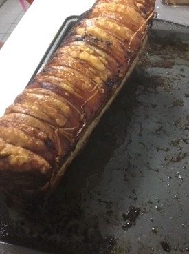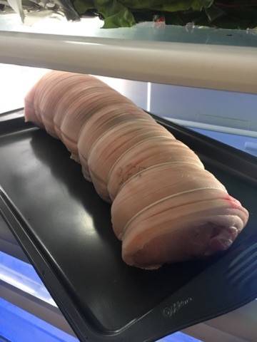 Remove the pork from the refrigerator and check that the rind is dry and, if desired, use a hairdryer on the cold setting to ensure it is. Rub generously with salt (ordinary salt or cooking salt is best), massaging it into the cuts in the skin. Leave at room temperature while the oven preheats to 230°C. Place the pork on a rack in a heavy baking dish and roast for around 30 – 40 minutes or until the skin begins to crackle.