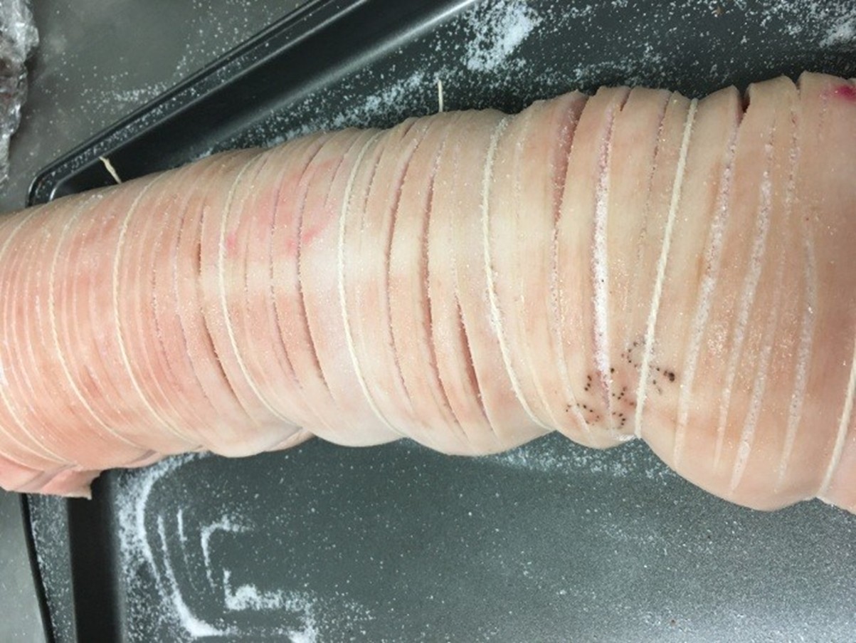 To prepare the pork, score the skin by making cuts 1 cm apart using a very sharp knife. Even if your butcher has done this for you, it is best to add extra scores.