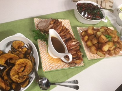 After 30 – 40 minutes, when the skin is crackling, if the skin also extends underneath the roll, turn the pork over. (Insert a meat thermometer if you have one.) Reduce the oven temperature to 190°C, place the vegetables in the oven and continue to cook for 60 minutes or more, turning the vegetables at least once.